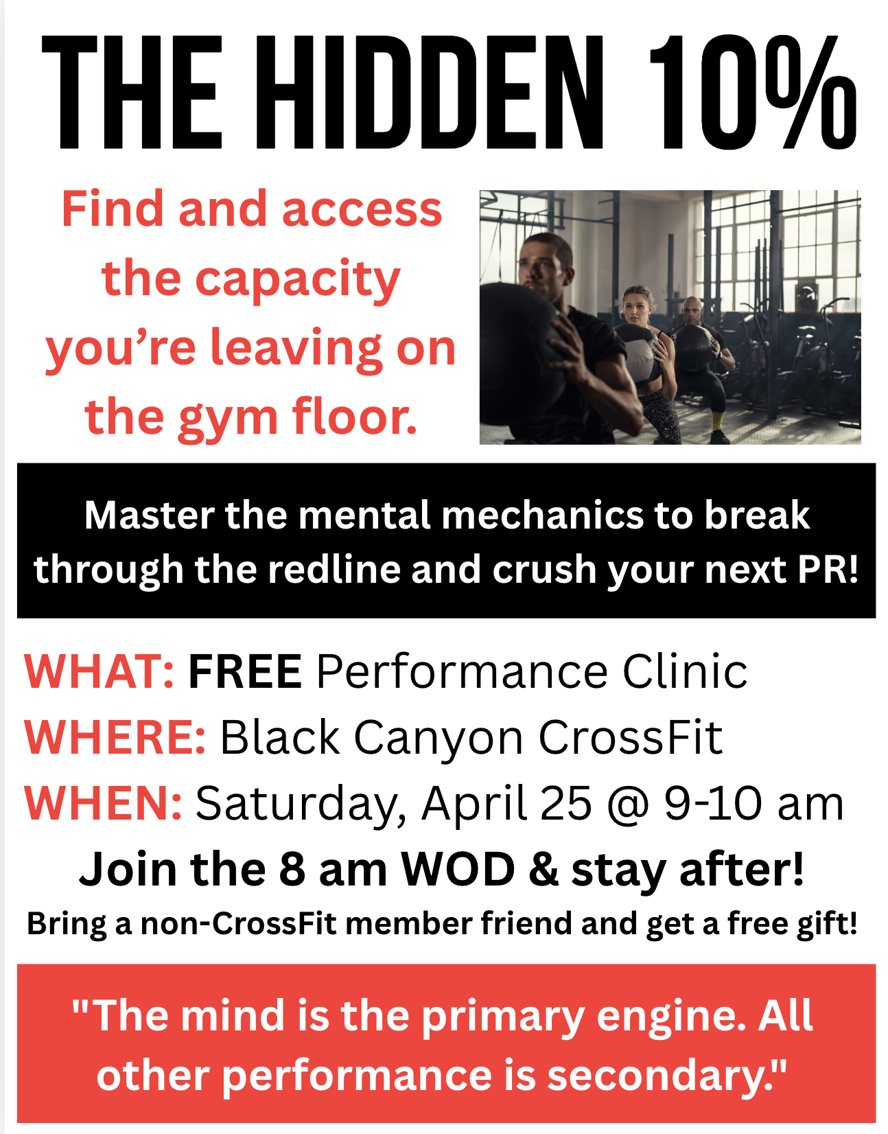 Upgrade your mental game at the gym! This workshop is geared towards CrossFit athletes, but all are welcome! Saturdays are “Bring a Friend” day at Black Canyon CrossFit, so come join us for a great workout at 8:00 am, and then stick around for this workshop afterwards. If you are planning to come, or if you have any questions, please shoot me a text at 435-262-2046 or email at lori@loriwatsoncoaching.com.